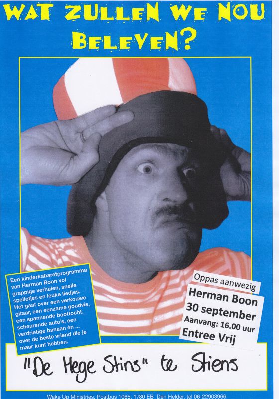 Cabaretier, liedjesschrijver & evangelist Herman Boon zal op 30 september as. Op cabareteske wijze het verhaal van Noach opnieuw vertellen. Het kindercabaret programma zit vol grappige verhalen, snelle spelletjes en leuke liedjes. Het gaat over een verkouden gitaar, een eenzame goudvis, een spannende boottocht, schurende auto’s, een verdrietige banaan en ………over de beste vriend die je maar kan hebben!
